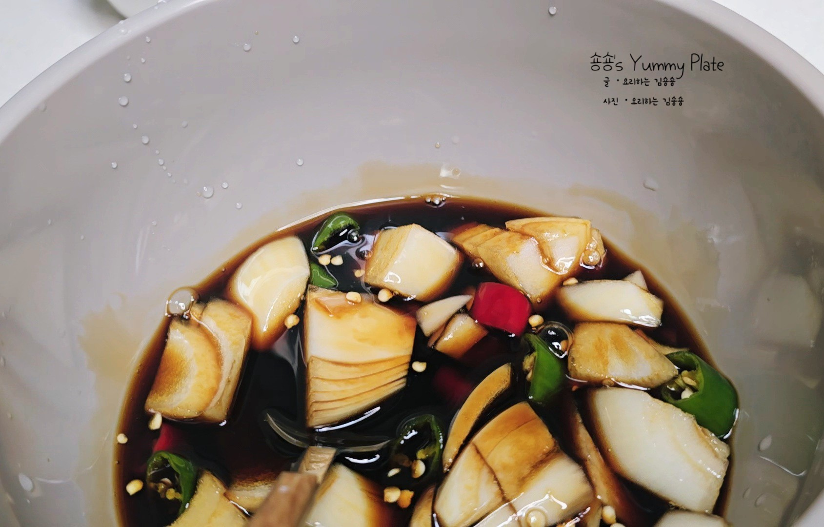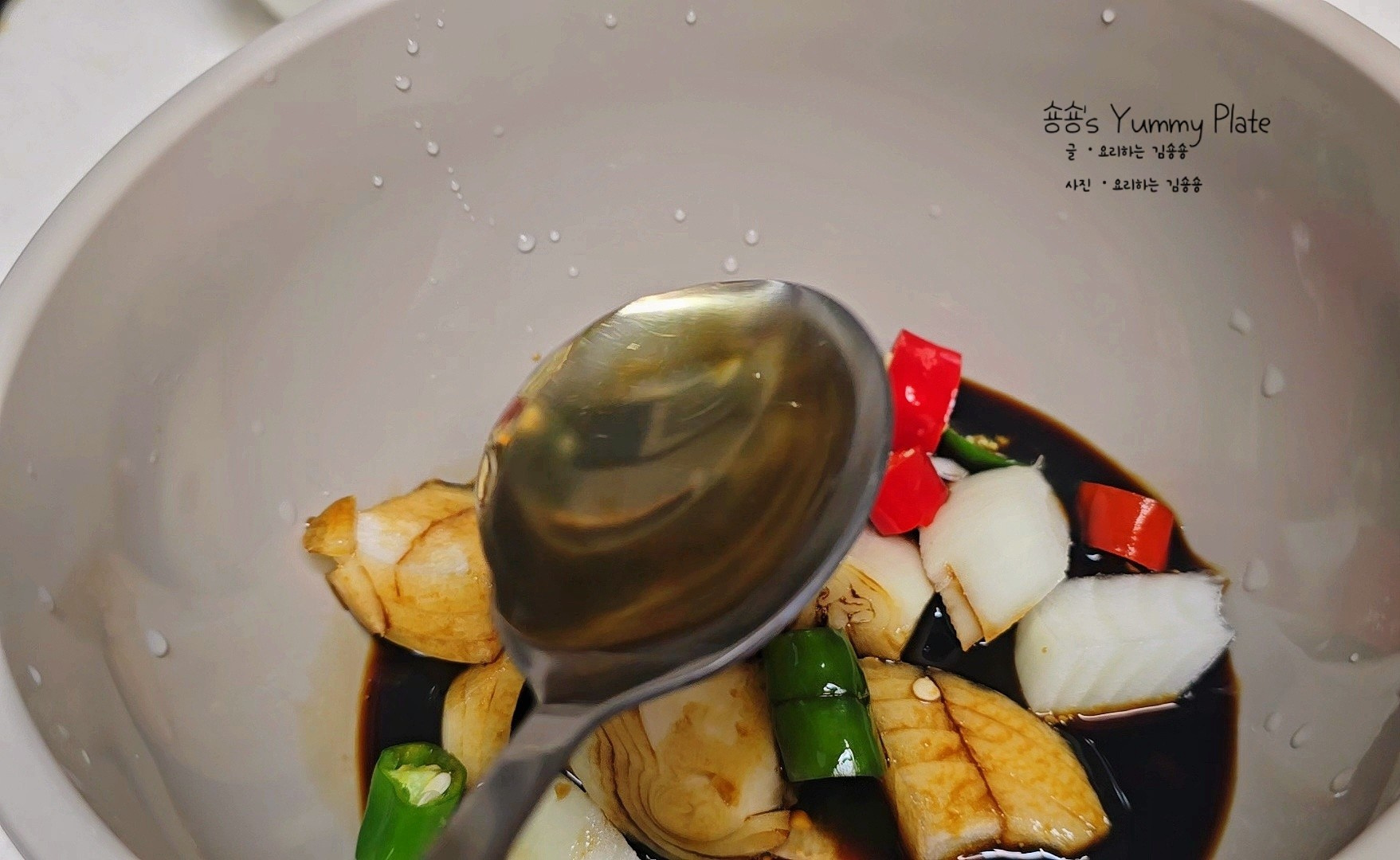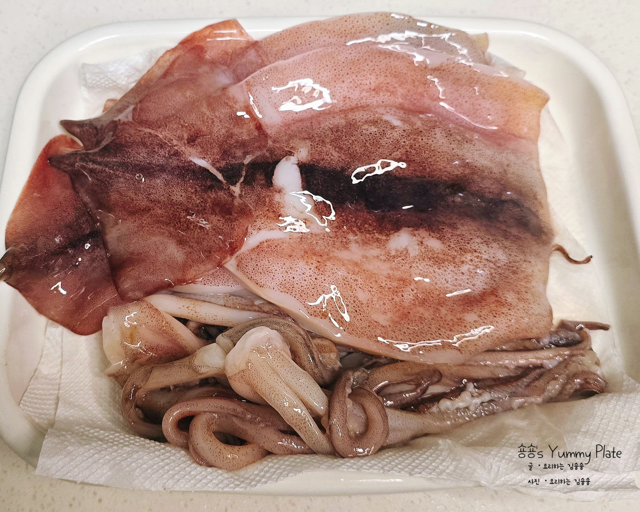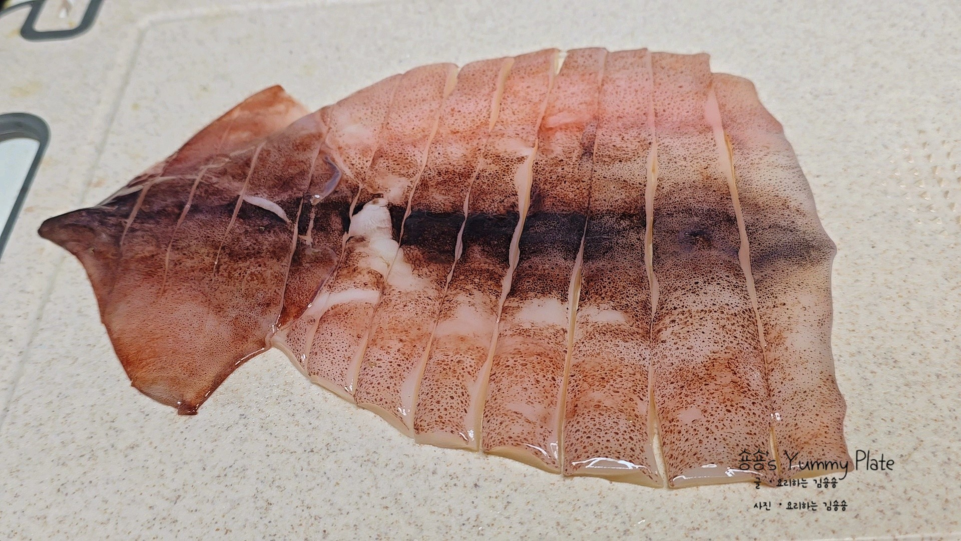 이렇게 잠깐 재워두면 오징어 특유의 비린 맛은 잡아주고 간도 은은하게 배어 훨씬 맛있답니다!