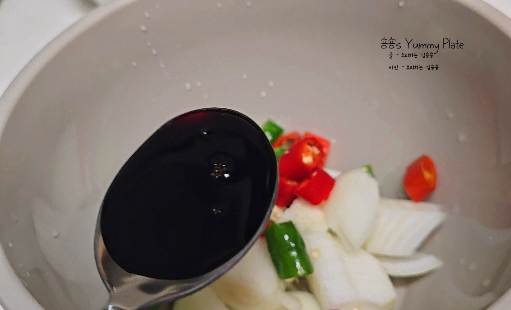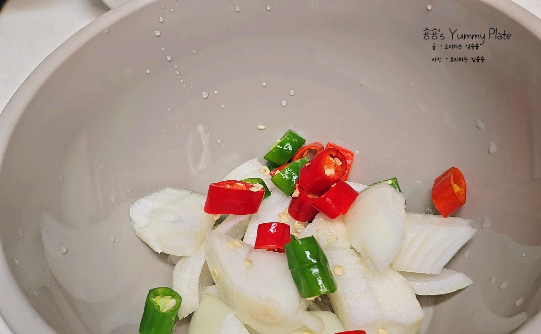 볼에 썰어둔 양파와 고추를 넣어주세요.