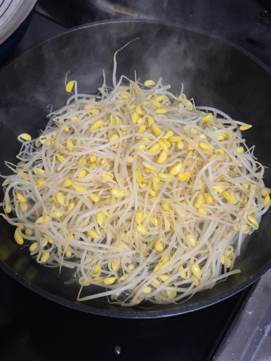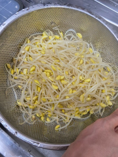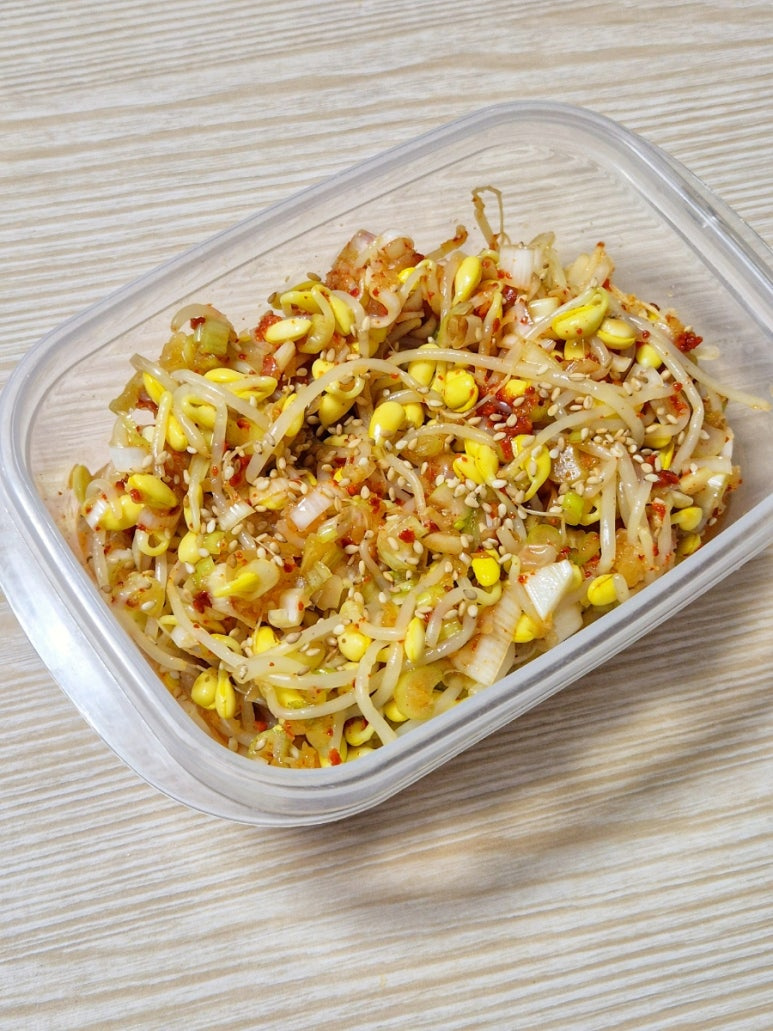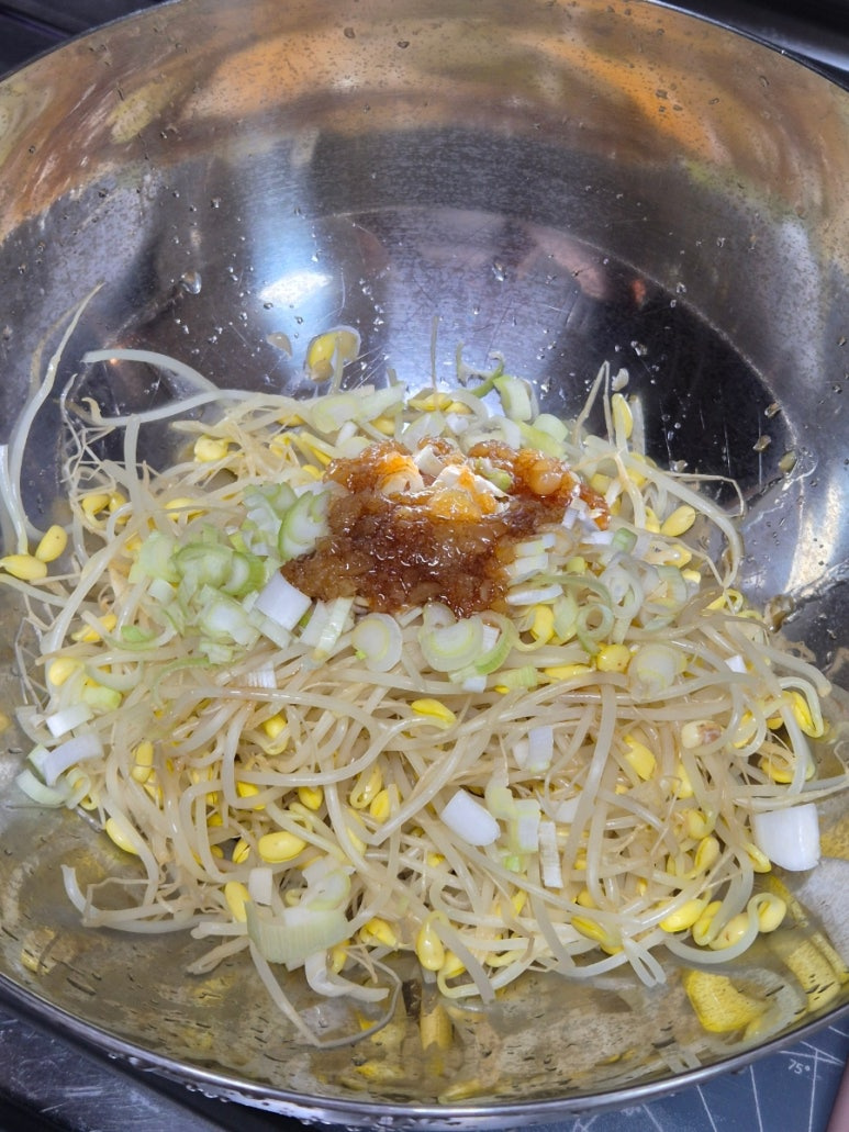 여기서 고춧가루 반 스푼을 넣으면 빨간 콩나물무침을 만들 수 있어요. 부족한 간은 맛소금으로 조절해주세요. 콩나물무침은 맛소금이 참 잘 어울리더라고요~