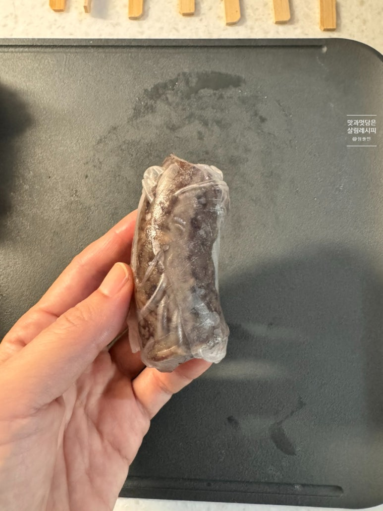 적당한 사이즈로 썰어주는데요. 기호에 따라 길게 썰어도 좋아요. 저는 8개가 나오는 분량으로 나무 꼬치에 꽂아 아이들이 먹기 좋게 좀 작은 사이즈로 썰었습니다.