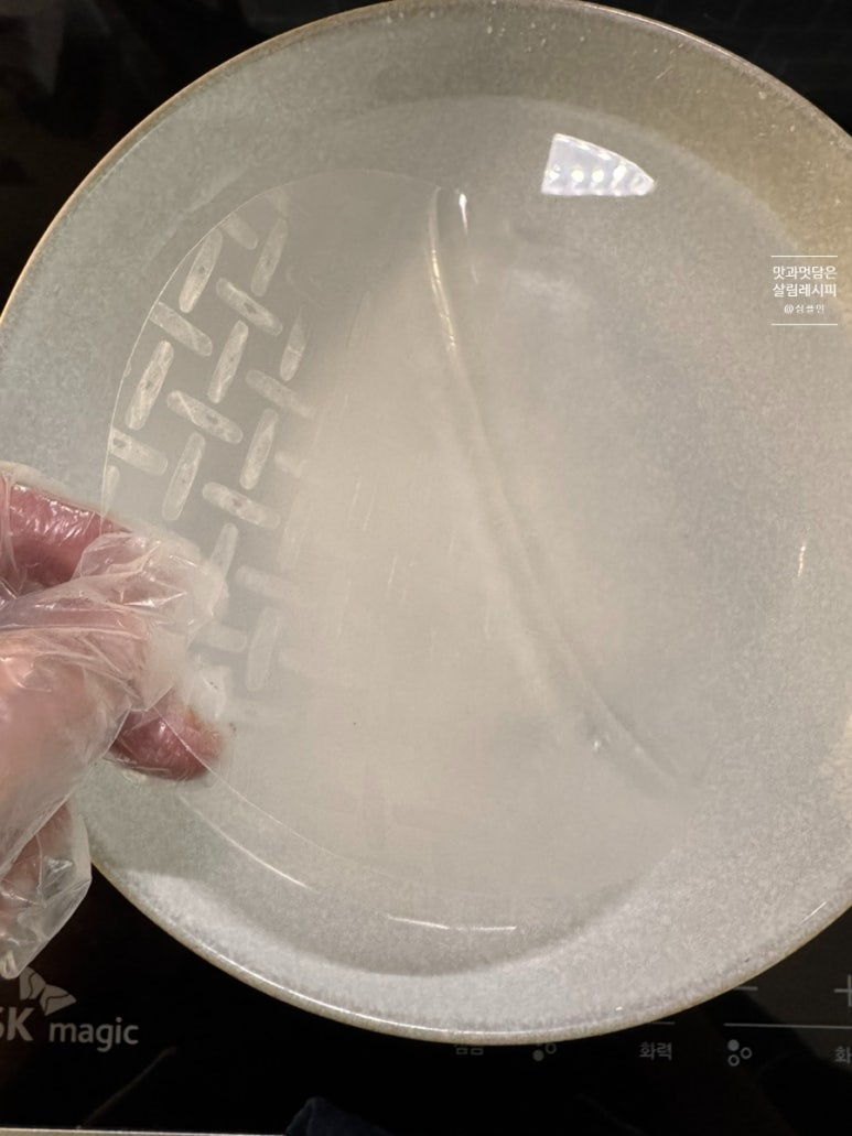 미지근한 물에 튀김옷을 대신한 라이스페이퍼를 부드럽게 만들어 줍니다.