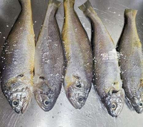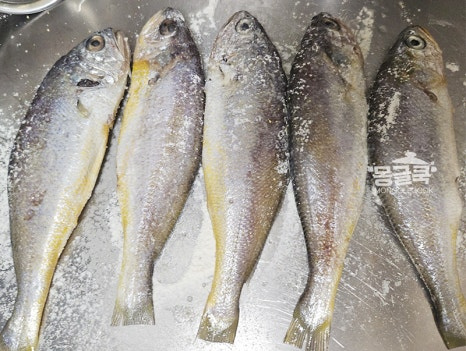 소금은 조기 표면에 눈이 내린 것처럼 얇게 덮일 정도가 적당해요.