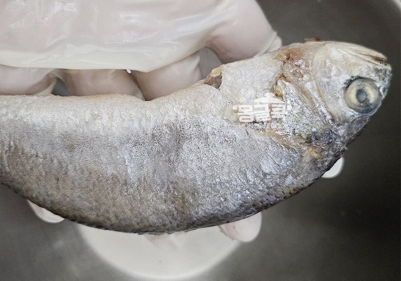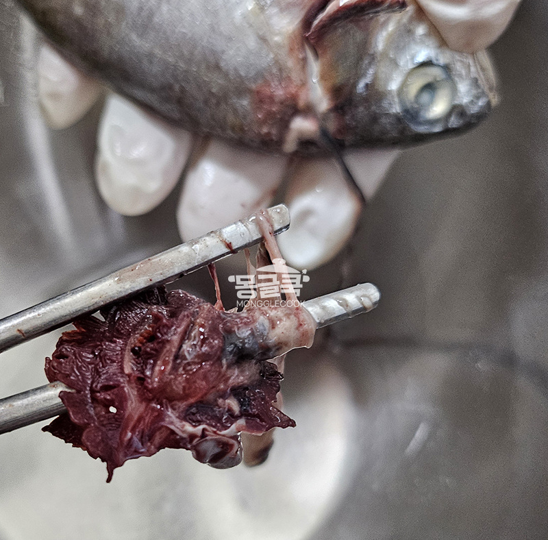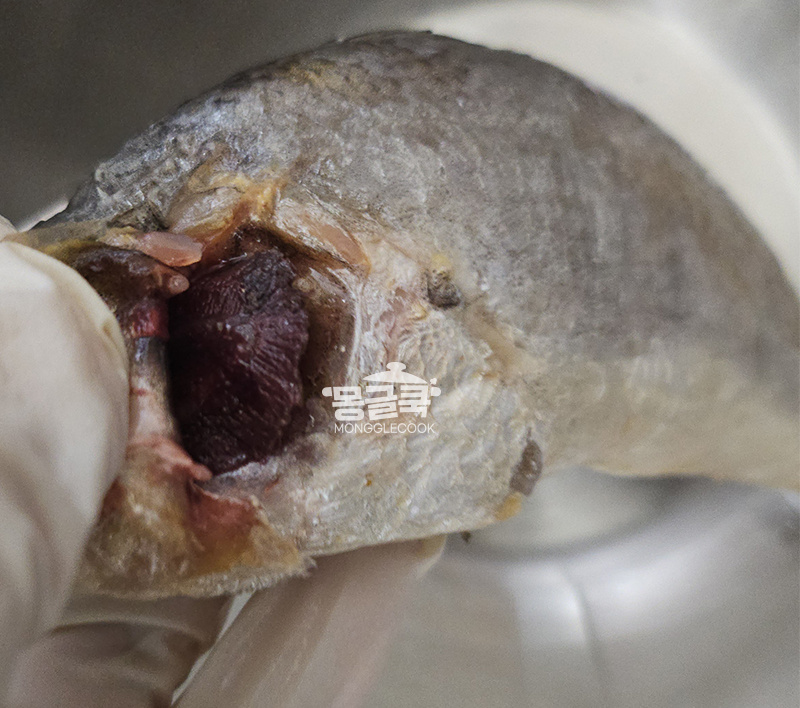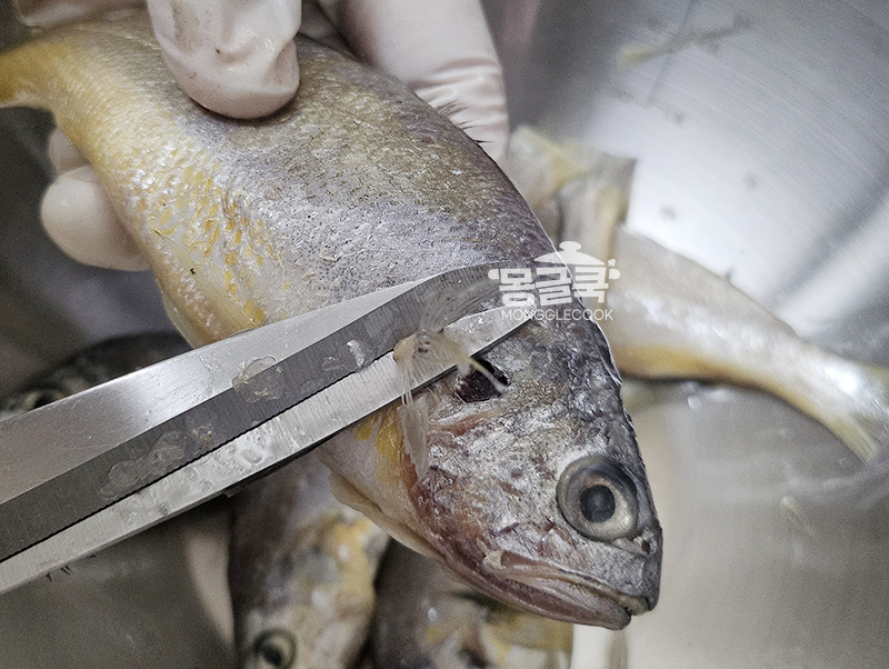 조기의 아가미를 살짝 들어 올려 손가락이나 나무젓가락을 안쪽 깊숙이 넣어주세요.