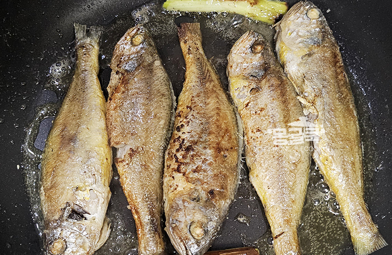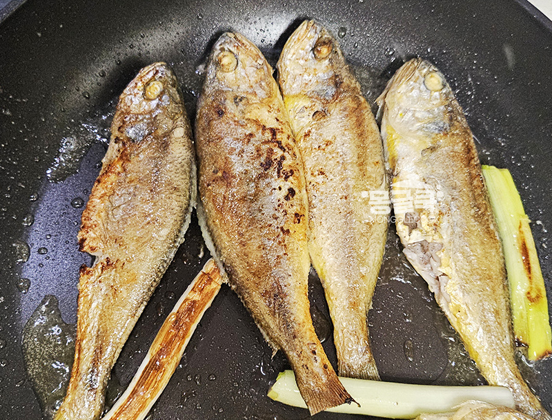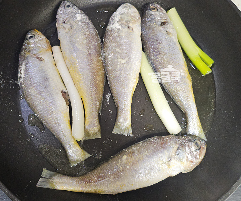 조기를 넣고 중불에서 천천히 노릇하게 구워주세요.