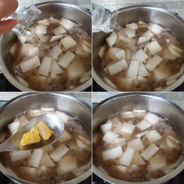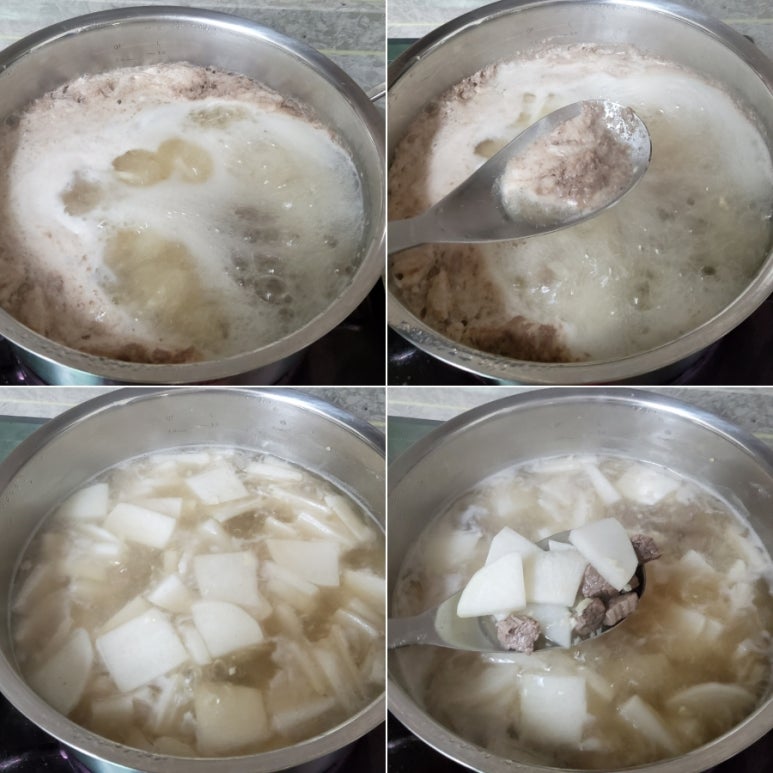 물500ml를 넣어서 강불로 끊여준후 거품이 생기면 숟가락을 이용해서 모두 걷어내줍니다.