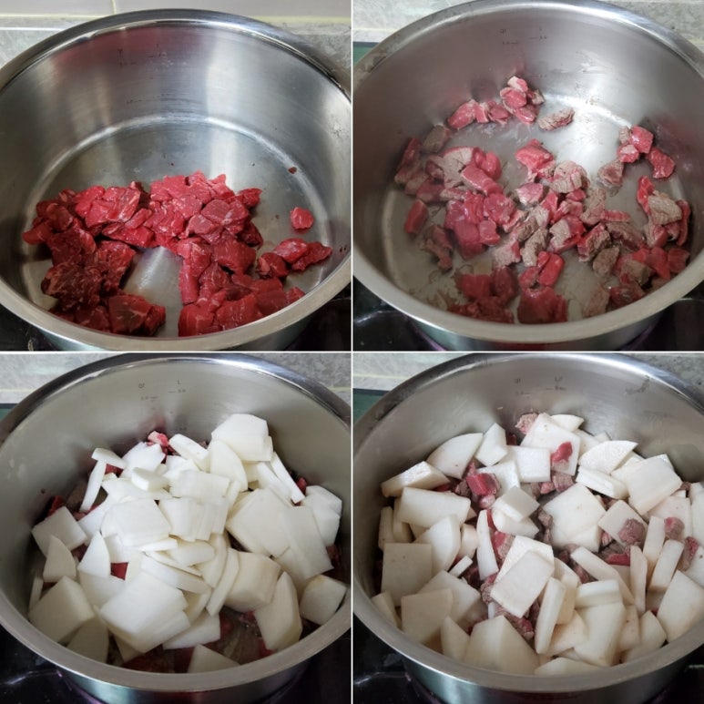 *한우국거리와 깍뚝쎃어놓은 무를 함께 볶다가 물을 부어주기 전에 국간장으로 먼저 한우와 무에 간이 베이도록 볶아준후 물을 넣어서 강불로 보글보글 끊여주세요.