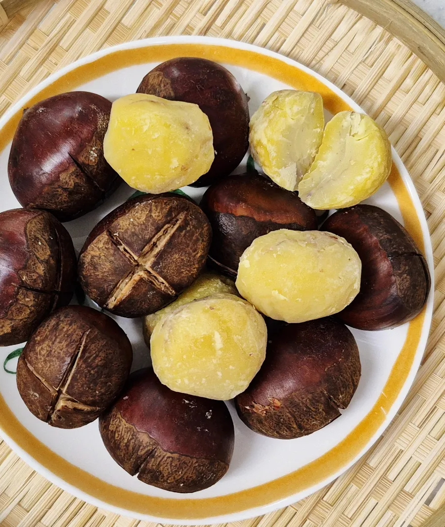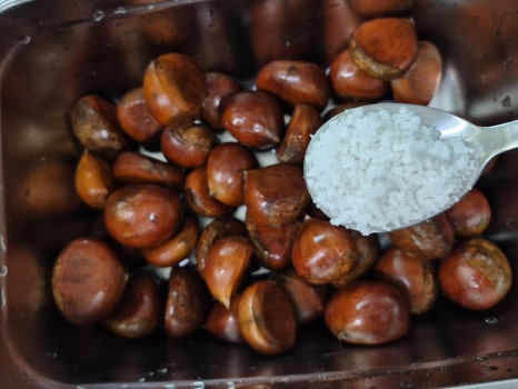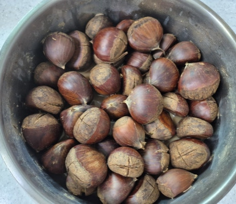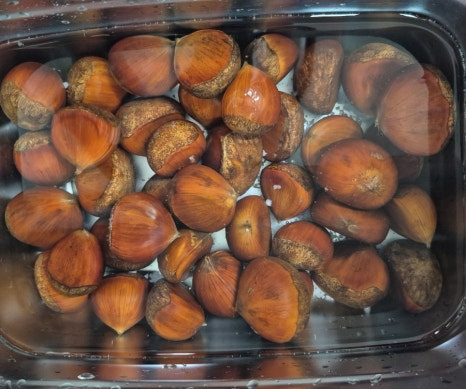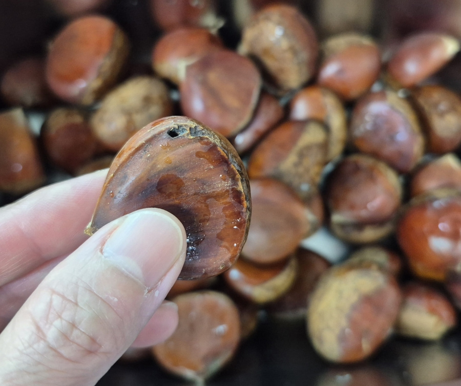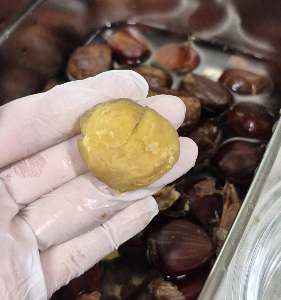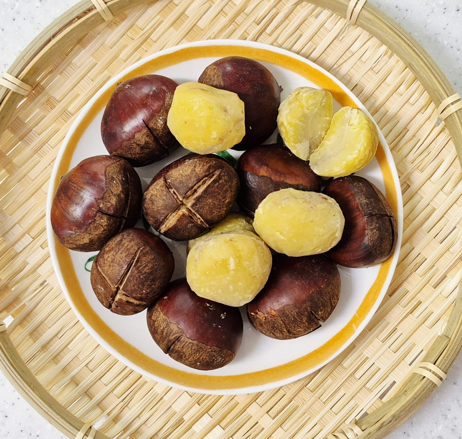 밤이 식으면 껍질이 다시 속살에 달라붙어 깔끔하게 벗기기 힘들어지니 완전히 식기 전에 껍질을 벗겨 드세요.