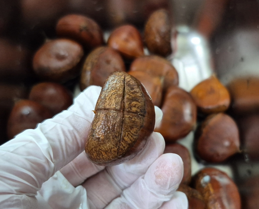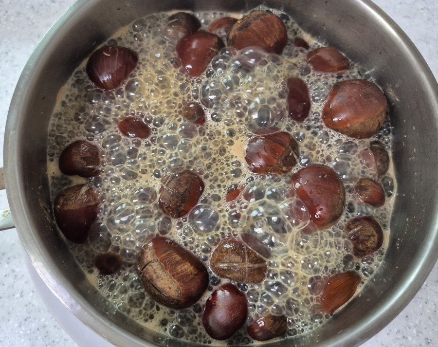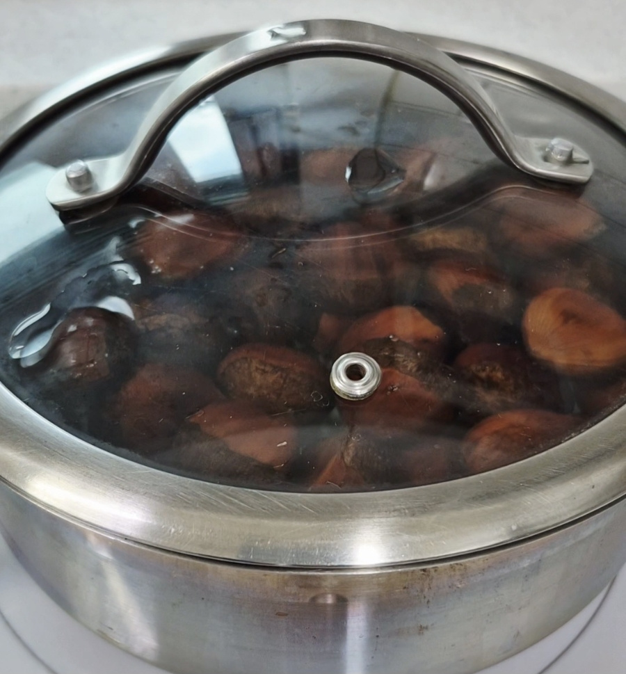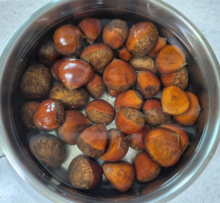 밤이 식으면 껍질이 다시 속살에 달라붙어 깔끔하게 벗기기 힘들어지니 완전히 식기 전에 껍질을 벗겨 드세요.