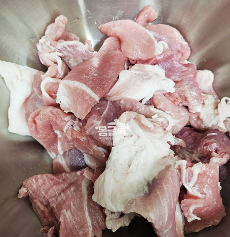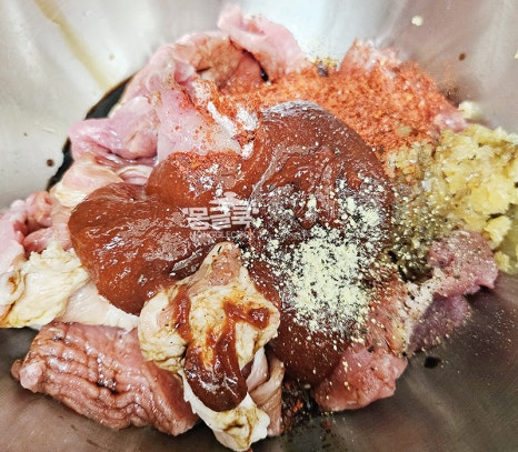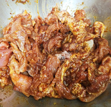 손질한 돼지고기에 양념장을 넣고 잘 버무려주세요.
