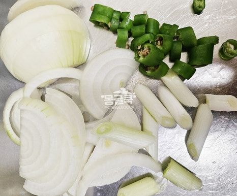 양파, 청양고추를 넣고 센 불에서 1~2분 정도만 빠르게 볶아 채소의 아삭한 식감을 살리고 물이 생기는 것을 막아주세요.