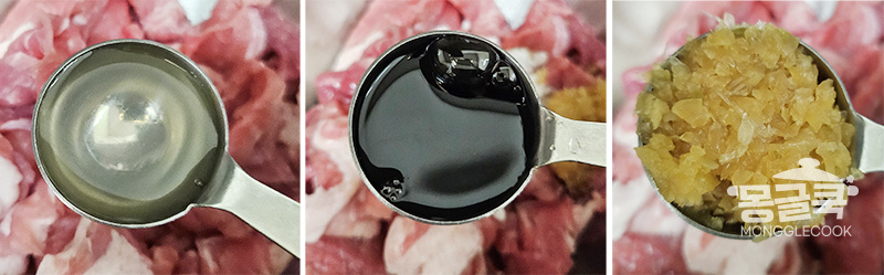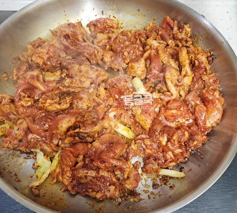 이때 고기를 펼치고 자주 뒤적이지 않아야 물이 생기지 않고 겉면이 살짝 타듯이 볶아져 불맛이 입혀져요.