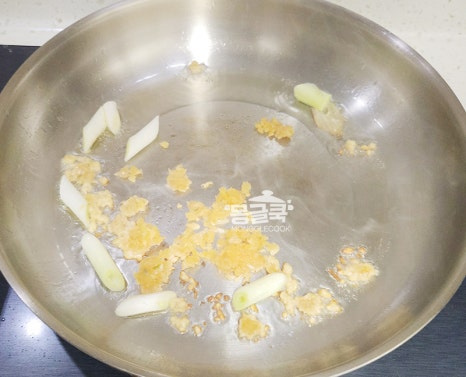 식용유 3~4 큰술을 두르고 다진 마늘과 대파(흰 부분)를 넣어 강불에서 빠르게 볶아 파마늘 기름을 만들어주세요.