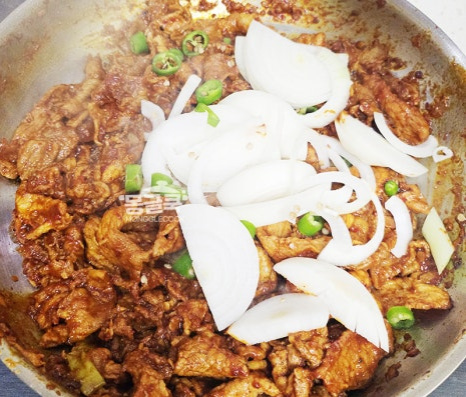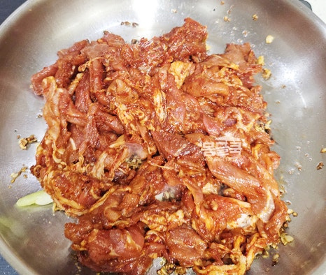 양념에 재워둔 돼지고기를 넣고 강불에서 빠르게 볶아 주세요.