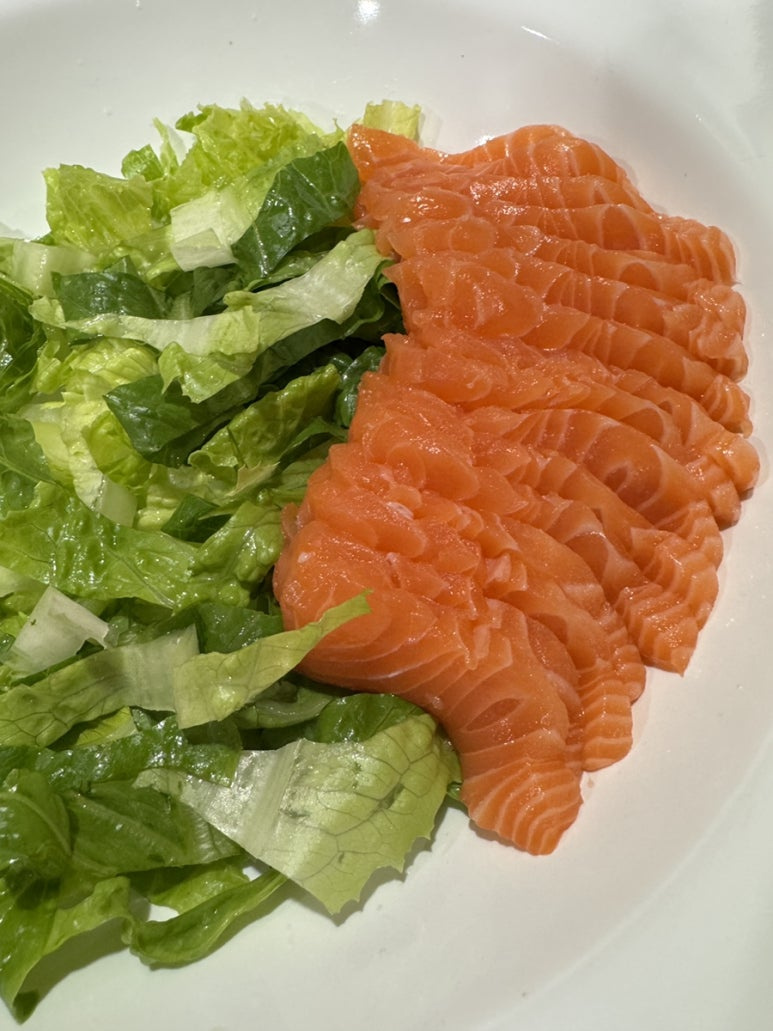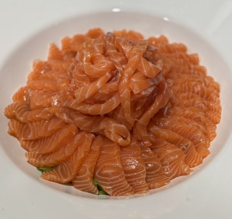 그 위에 연어회를 도톰하게 썰어 올려주세요.