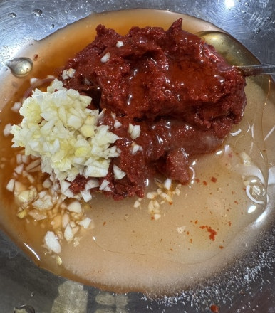 고추장 1컵 , 식초 1컵 , 설탕 1컵 , 간장 1큰술 , • 다진 마늘 1큰술 , • 연겨자 약간 (선택) , • 사이다 또는 물 (농도 조절용)