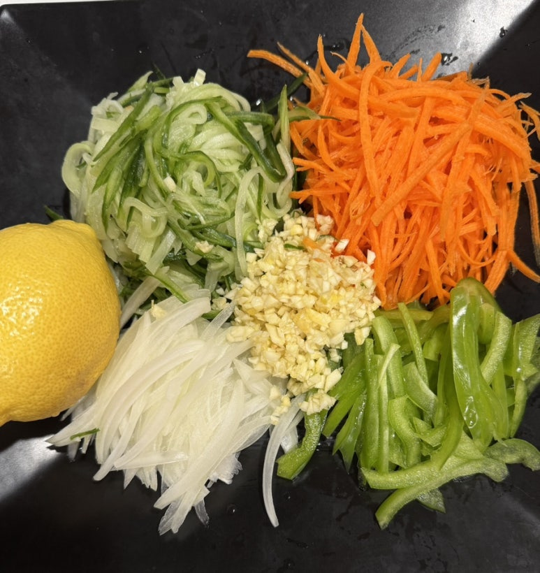 오이 1개 , 당근 작은거 1개 , 양파 1/4개 , 초록 파프리카 1/2개 , 레몬 1개 , 로메인 상추 6장