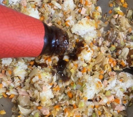 굴소스 한큰술 넣고 스팸도 넣고 볶고 볶아 주면 야채들에서 나오는 감칠맛과 굴소스의 감칠맛과 김치의 개운한 맛이 어우러져 자꾸 자꾸 먹어도 땡기는 주먹밥이 되요.