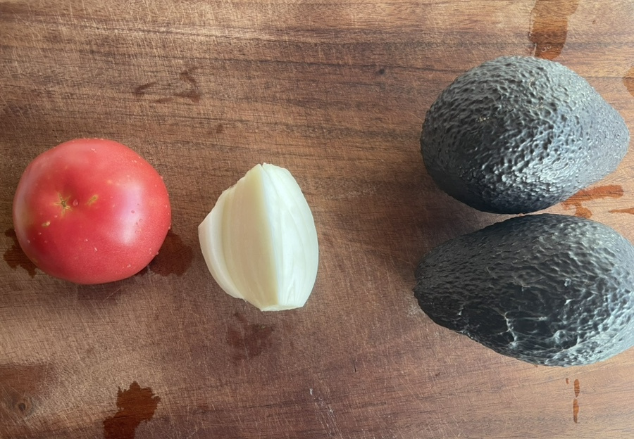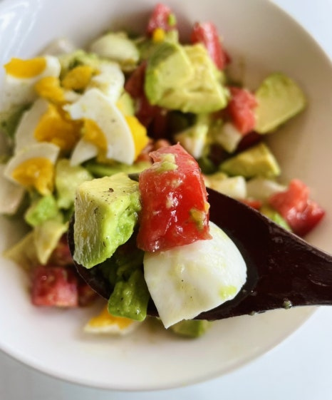 아보카도 2개 , 토마토 1개 , 삶은 계란 1개 , 양파 1/4개 , 올리브오일 3큰술 , 레몬즙 2큰술 , 꿀 1큰술 , 소금 2꼬집 , 빵 1-2조각 (취향에 따라)