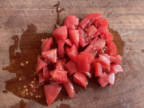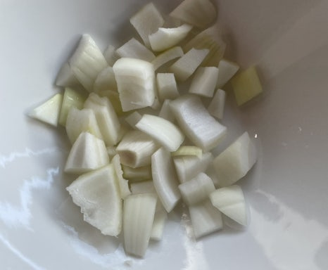 토마토와 양파를 씻어 작게 깍둑썰기 해주세요.