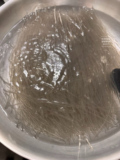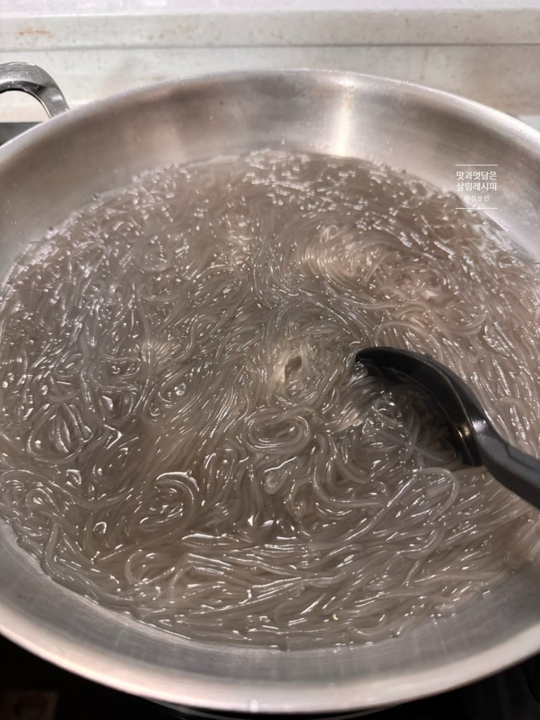 넉넉한 냄비에 물 2L 가량 넣고 보글보글 끓여주세요. 끓기 시작하면 당.면을 넣고 넣은 시점 기준으로 8분 끓여줍니다.
