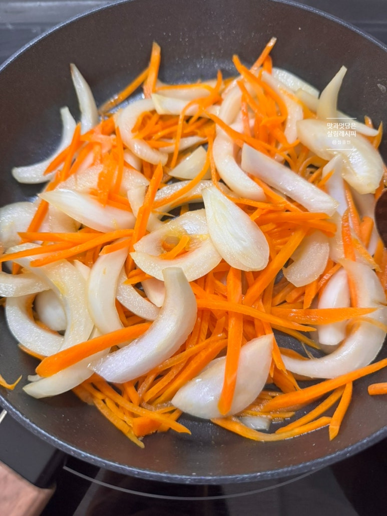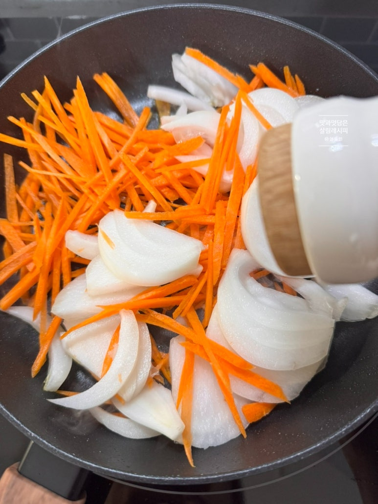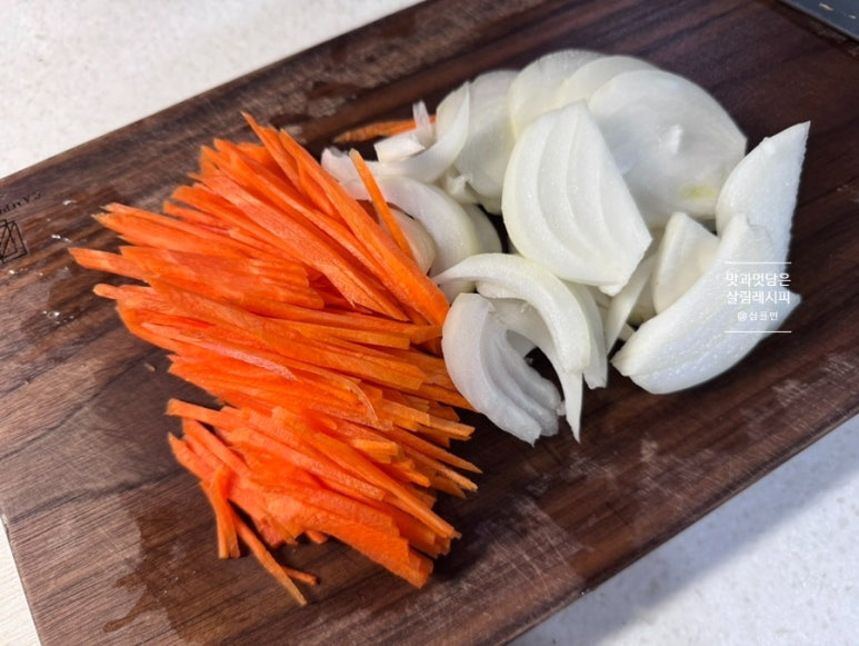 당근은 채 썰고 양파는 적당한 두께로 썰어줍니다. 오늘은 기본 야채로 당근과 양파 준비했지만 파프리카 등 추가 재료 넣어주면 알록달록 보다 맛있게 만들 수 있어요.