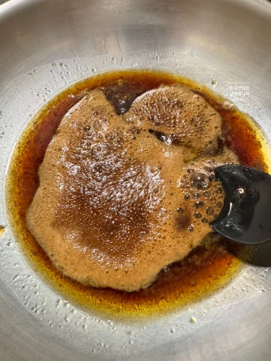 준비한 양념을 팬에 담아 끓어오를 때까지 가볍게 가열합니다. 면 삶은 냄비를 활용하면 좋아요.