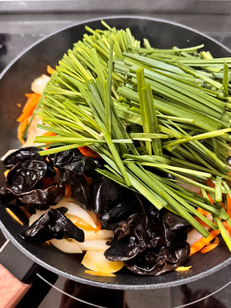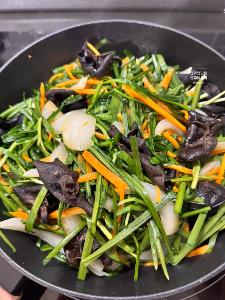 어느 정도 야채가 볶아지면 마지막 단계에 연한 부추와 불린 목이버섯을 넣어줍니다. 1~2분가량만 더 볶아 마무리합니다.
