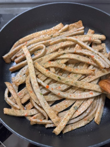 사각어묵을 얇고 길게 썰어 꼬들꼬들하게 한 번 볶아주고요. 양파와 당근도 썰어 소금 소량만 넣고 휘리릭 볶아냅니다. 추가로 파프리카 등 취향에 맞는 채소류 넣어도 좋고요. 버섯은 건목이버섯을 불려 사용하였는데 느타리버섯이나 표고버섯을 넣어도 무방합니다.