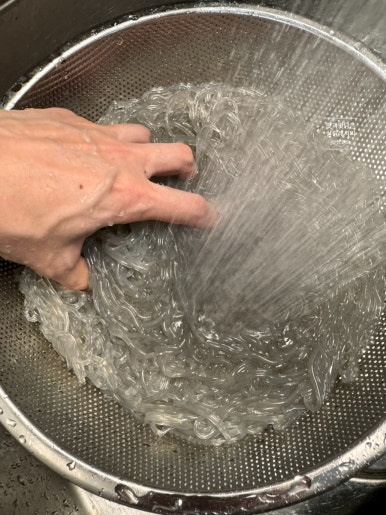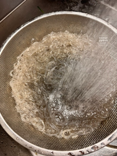 시간 맞춰 끓인 면은 바로 물에 헹구어 전분기를 제거해 주면서 탱글탱글한 면발로 만들어 주는 작업을 해줍니다.