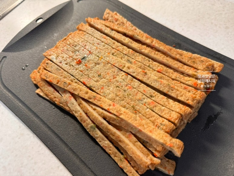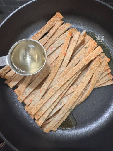 고기 대신 활용할 사각어묵 3장을 길게 채 썰 듯 얇게 썰어주었어요. 이렇게 썰면 면과 함께 휘리릭 먹기 좋아요. 달군 팬에 식용유 2큰술과 미림 1큰술 넣고 꼬들꼬들하게 볶아줍니다. 볶은 후 따로 덜어주고요. 바로 여기에 야채들 볶아줄게요.
