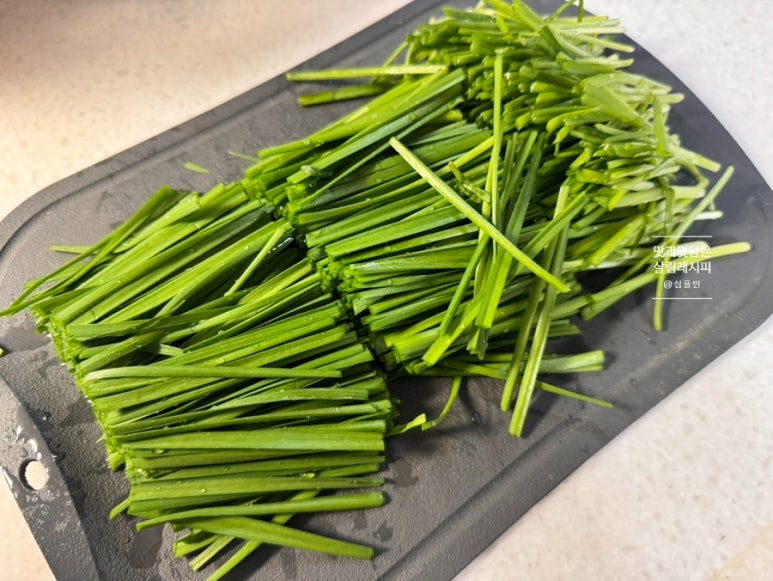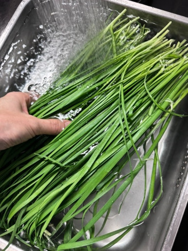 시금치 대신 준비한 부추는 식초 한두 큰술 넣은 물에 흔들흔들 세척해 헹구어 준 뒤 10cm 정도의 폭으로 듬성듬성 썰어 준비합니다. 시금치처럼 따로 데치지 않고 재료와 함께 가볍게 볶기만 하면 되니 풍미는 가득 살리면서 방법은 훨씬 손쉬워요.