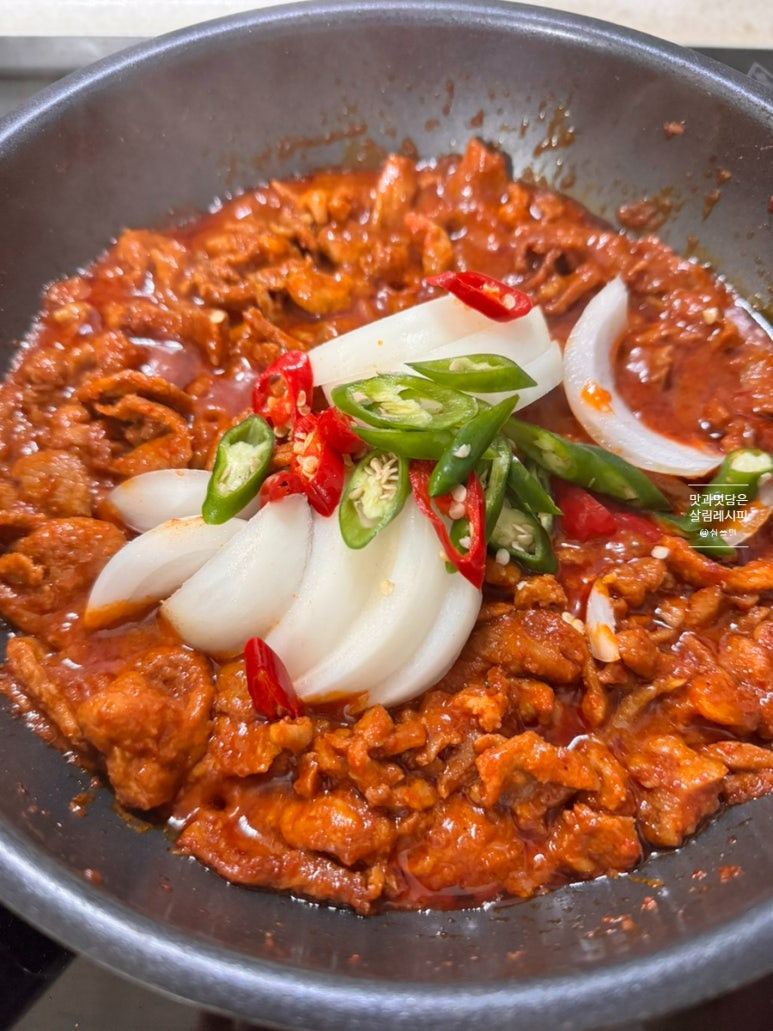 마무리 단계로 양파와 고추 넣고 1~2분가량 더 볶아냅니다. 아삭한 정도만 양파가 익는 것이 좋기 때문에 가볍게 볶아주었어요.