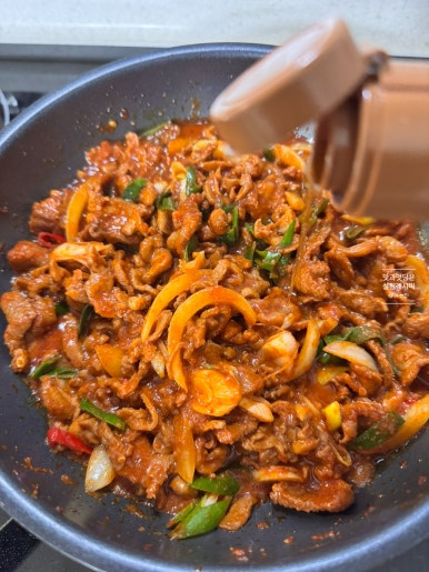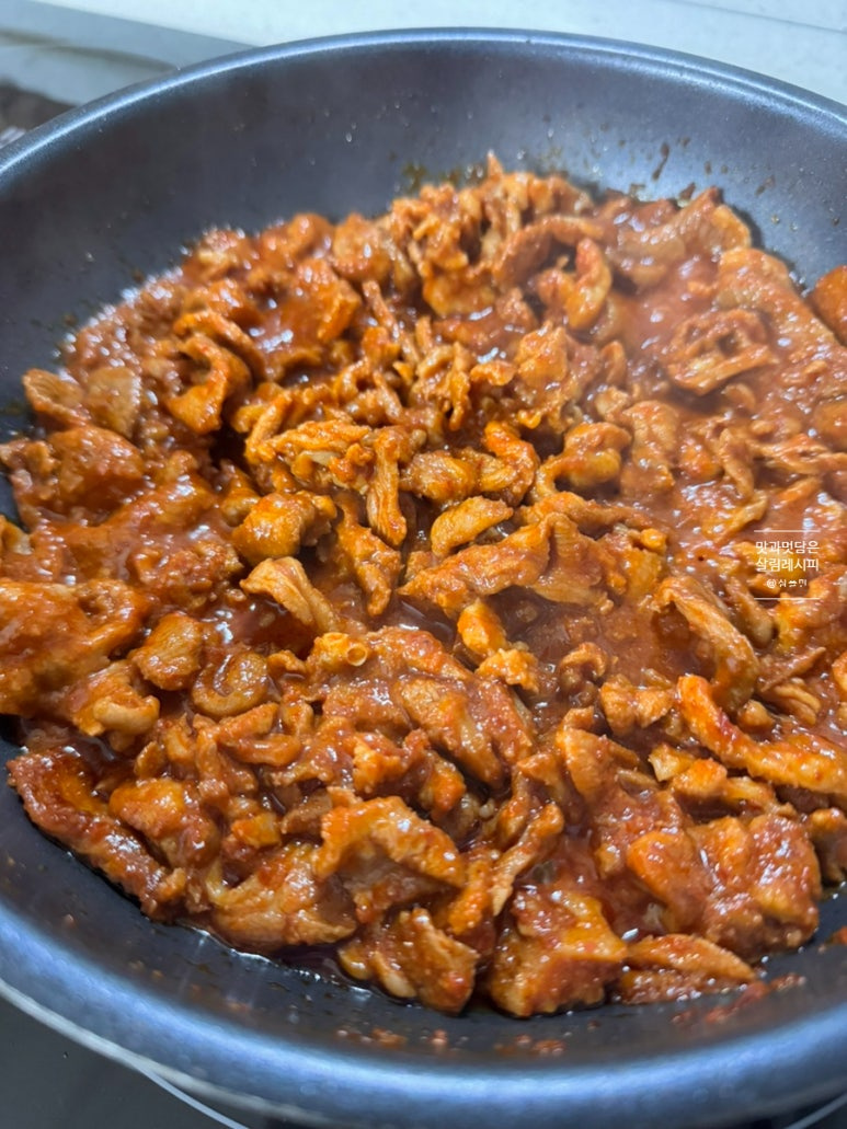 다음 이제 고루 모두 섞어줍니다. 약간 센 불 상태 유지하면서 양념을 진하게 조려 바싹 볶으면 맛있어요. 고기가 굽으로 꼬들꼬들하게 볶아지 느낌이 들 때까지 볶습니다.