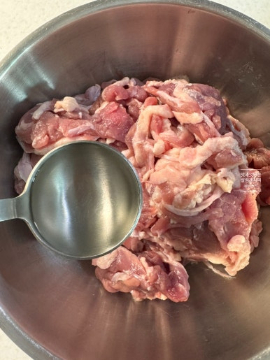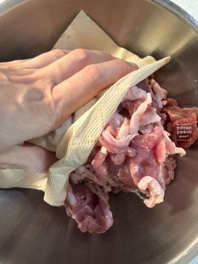 생오리고기의 핏물을 꾹꾹 눌러 흡수시켜주고 소주나 청주도 2큰술 둘러 잡내를 제거해 주는 작업을 합니다.