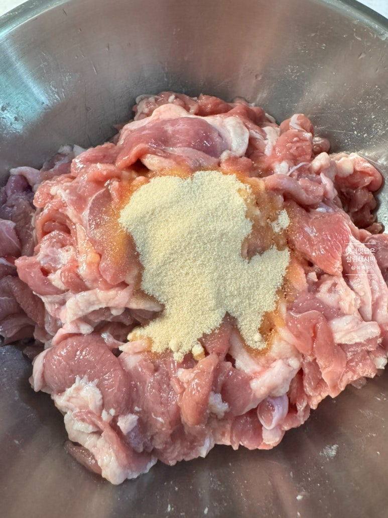 다음 다른 양념재료보다 앞서 입자가 큰 설탕 3큰술 먼저 넣어 조물조물해주면 단맛이 고기에 잘 침투되어 맛있게 무칠 수 있어요. 고루 섞이도록 조물조물 무쳐 주었어요.
