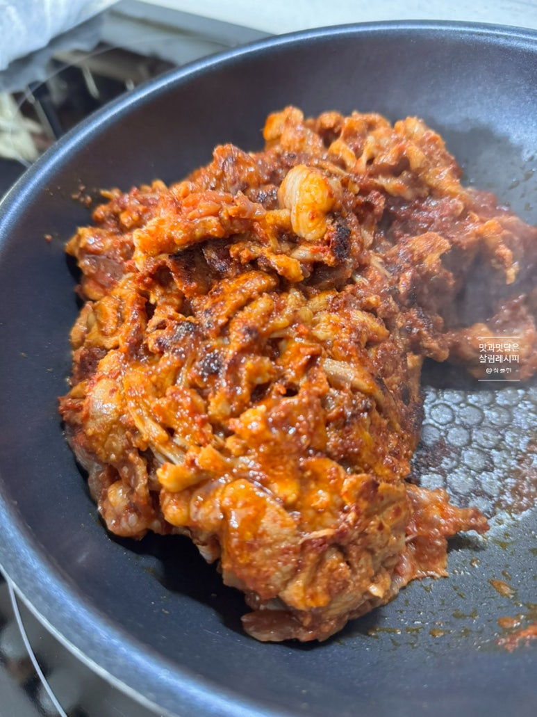 달군 팬에 조물조물해 준 양념육을 넣어 줍니다. 따로 기름을 두르지 않아도 충분히 기름기가 나옵니다. 약간 센 불에서 올려주고요. 잠시 그대로 두어 바닥이 갈색이 띄도록 구워져 풍미를 살려주도록 해요.