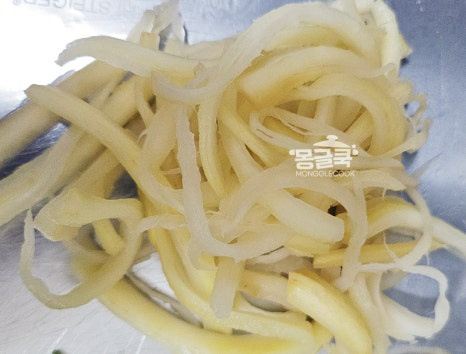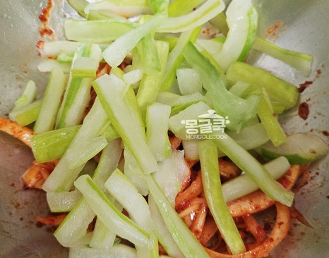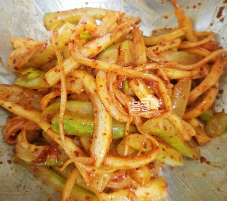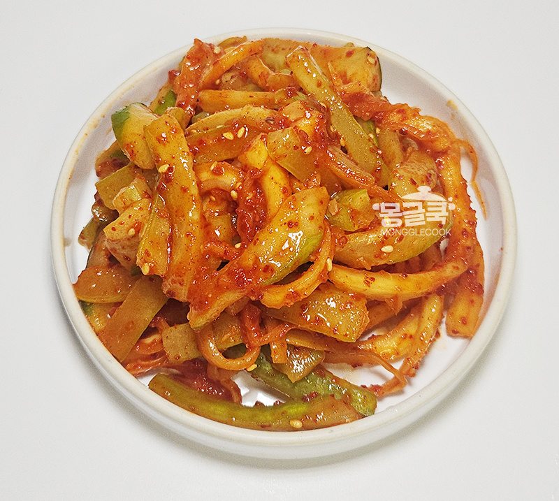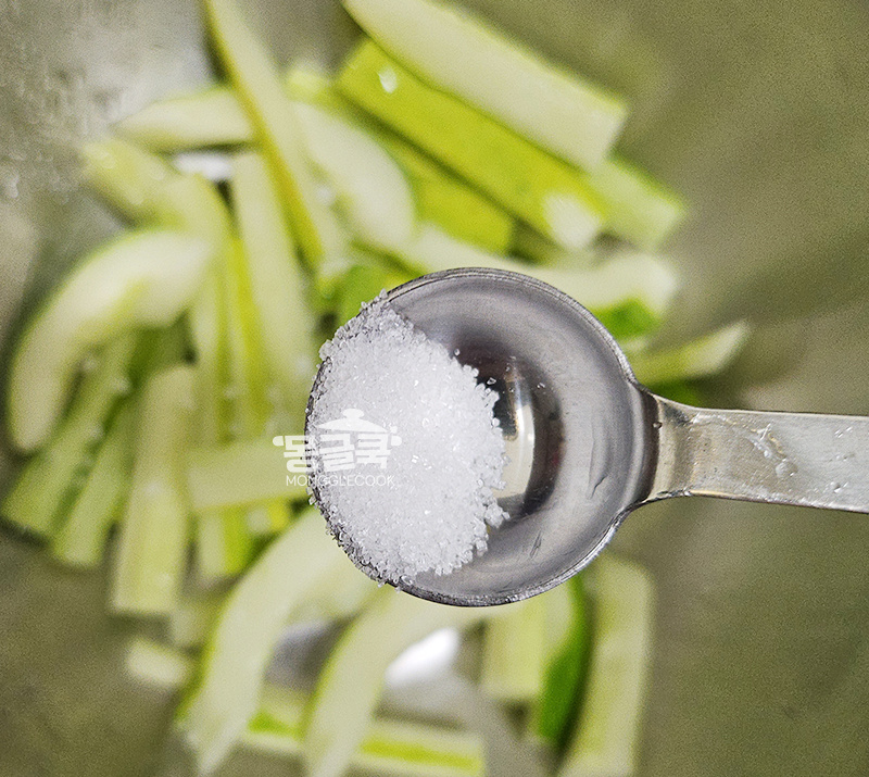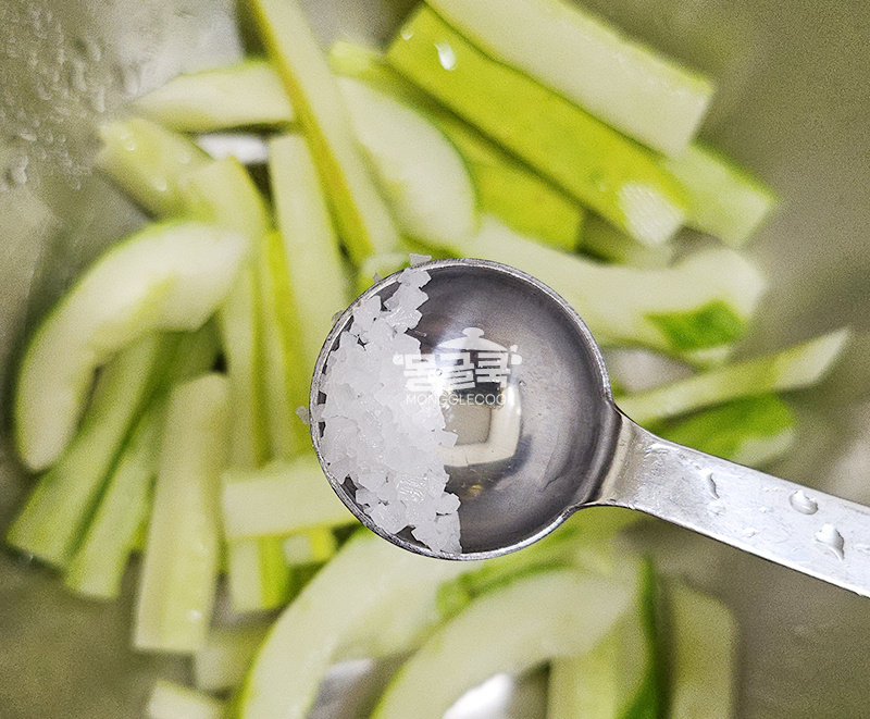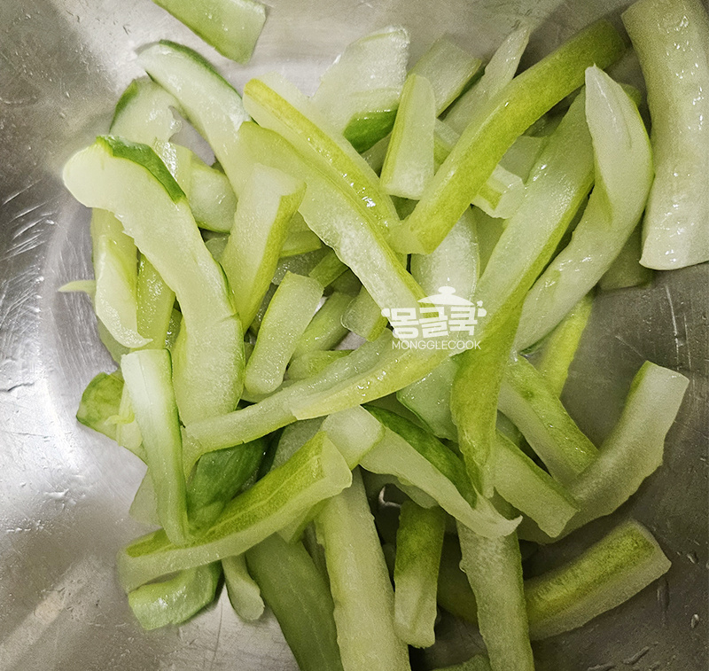 이렇게 썰면 도라지와 길이와 굵기가 비슷해져 양념이 골고루 배고, 무쳤을 때도 보기엔 단정하고 식감은 균일하게 아삭아삭 살아나요. 길쭉하게 썰면 오이의 수분이 덜 빠져 물기가 덜 생기고, 완성된 무침이 더 깔끔하고 고급스러운 느낌을 줘요.