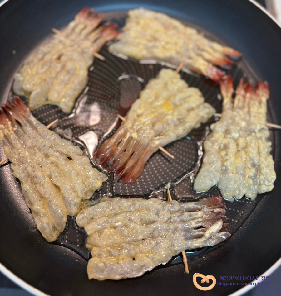 저는 노바시새우 60미를 준비했고요 5개씩 꽂으니 총 12꼬치가 나왔어요. 가볍게 한 접시 정도 드실 거라면 30미 6꼬치, 명절음식으로 준비하실 때는 60미~90미 정도 준비해 주시면 넉넉하게 드실 수 있답니다