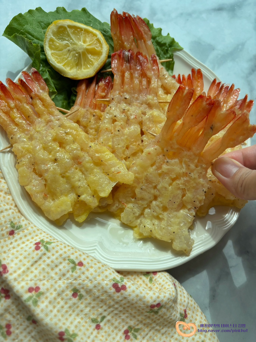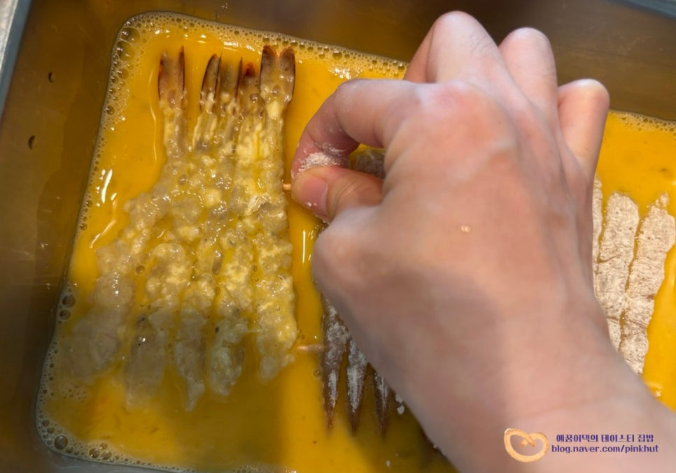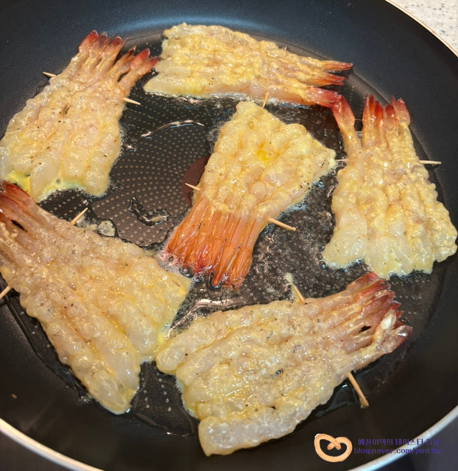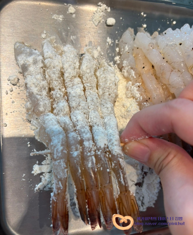 꼬리 부분에는 부침가루를 묻히지 않았어요 새우꼬리가 익으면서 빨갛게 예쁜 비주얼로 완성되거든요 ><
