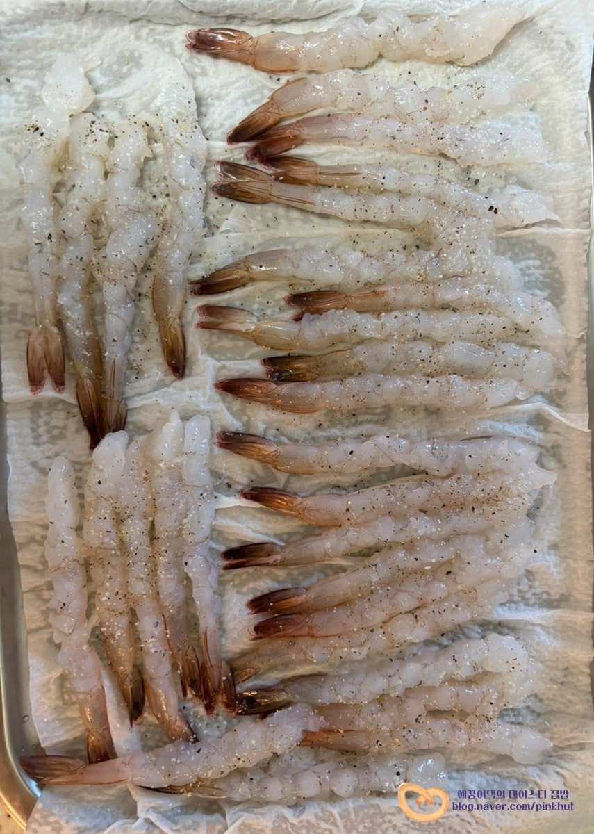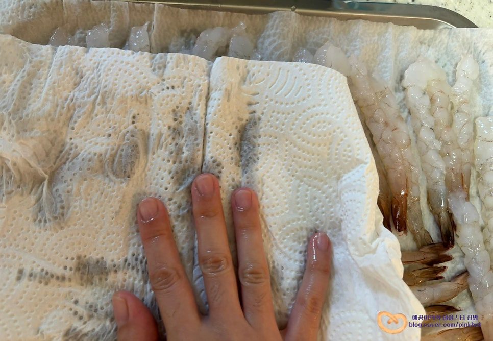 밧드나 트레이 위에 키친타올을 깔고 세척한 새우를 올려주세요. 그 위에 키친타올로 덮어 물기를 꼼꼼히 제거해 줄게요 튀김이나 전만들기 할 때는 재료의 물기를 잘 닦아주어야 기름이 튀지 않고 부침옷도 예쁘게 입혀져요