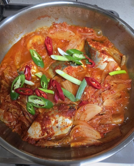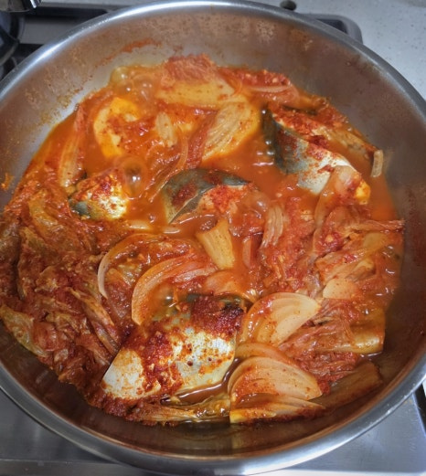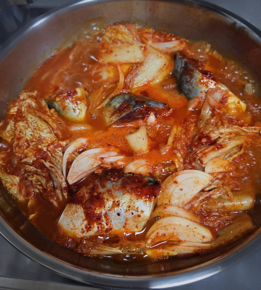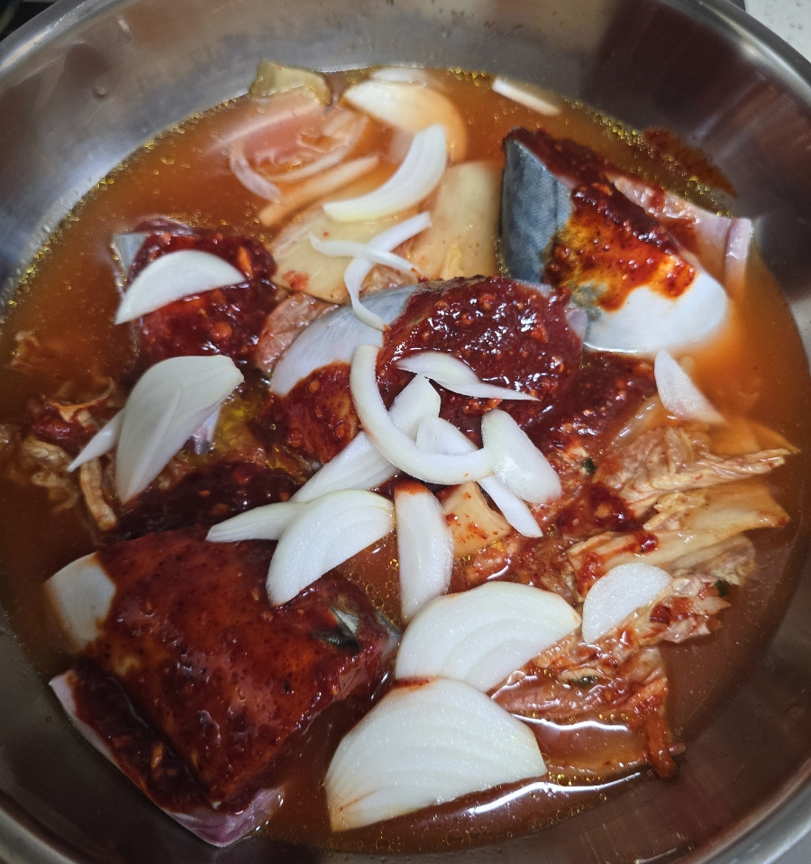 - 생 고등어 1마리 김치 1/4포기 + 들기름 1 양파 반 개 홍고추 반개 청양고추 한 개 대파 1대 , 양념 : 고추장 1 고춧가루 1 진간장 1 알롤로스 2 맛술 2 설탕 0.5 다진 마늘 1 생강가루 후춧가루 약간 물 500ml 정도 , 계량 : 밥숟가락 계량컵