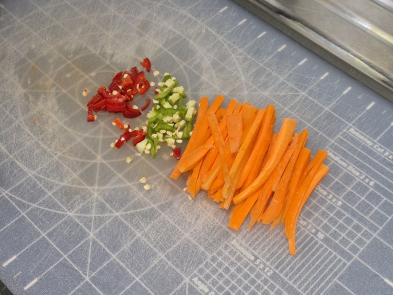 2. 그사이 청양고추와 당근을 사진과 같이 썰어주세요.