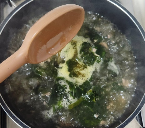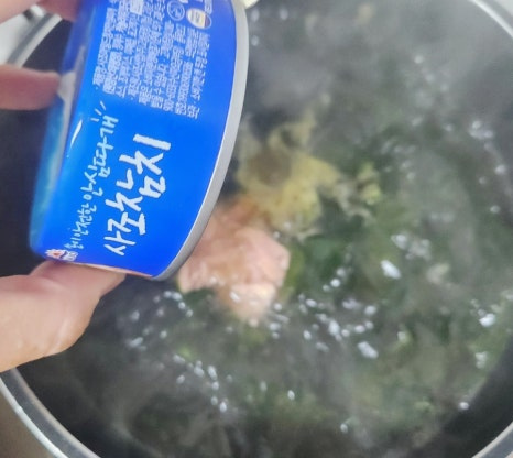 물이 보글보글 끓어오르면 참치캔(85g)을 기름까지 전부 넣어 주세요. 참치의 고소한 맛이 국물에 퍼져 한층 깊은 맛을 낼 거예요. 이제 불을 중불로 줄이고 15분 정도 푹 끓여줍니다. 끓이는 동안 거품이 조금 생길 수 있는데, 국물이 탁해지지 않도록 가볍게 걷어내 주세요.
