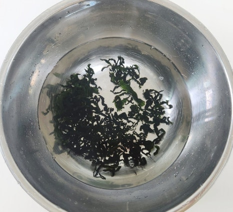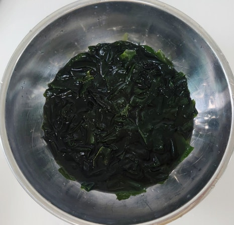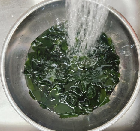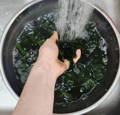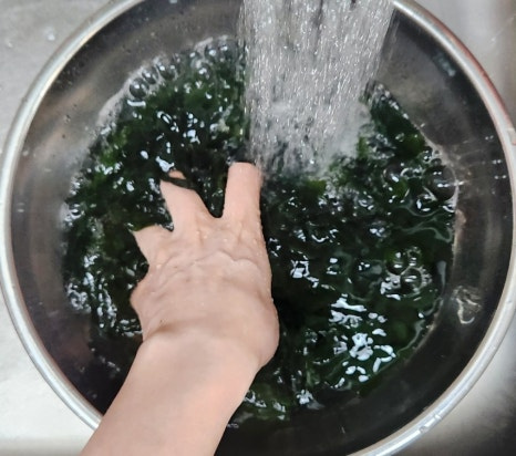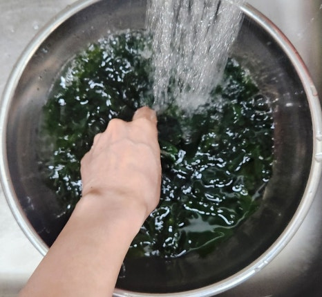 불린 미역은 손으로 4번 정도 바락바락 씻어야 바다 냄새가 빠지고 깔끔해지는데요. 다 씻은 미역은 마지막으로 물기를 꼭 짜서 건져 주세요.