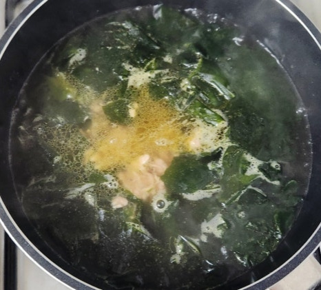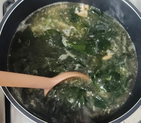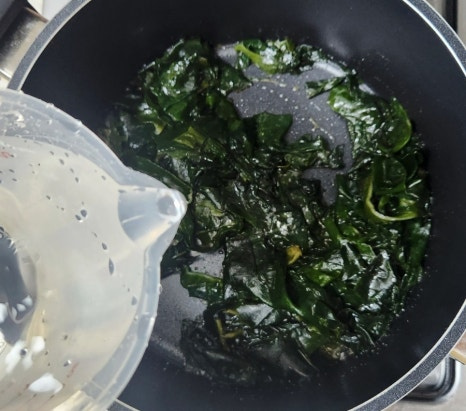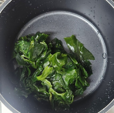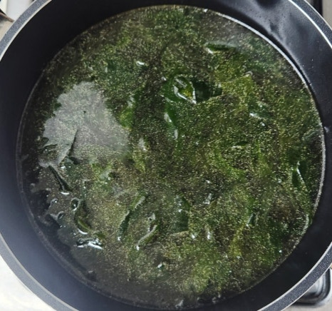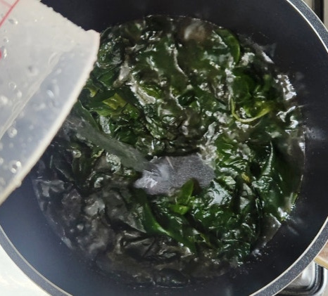 볶은 미역에 물 1200ml를 붓고 센 불에서 끓여주세요.