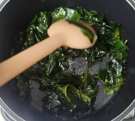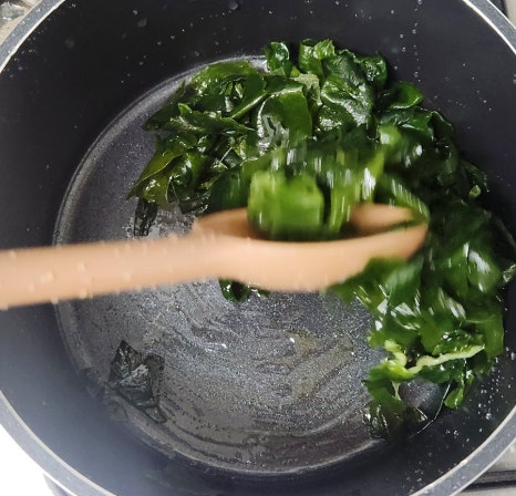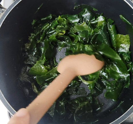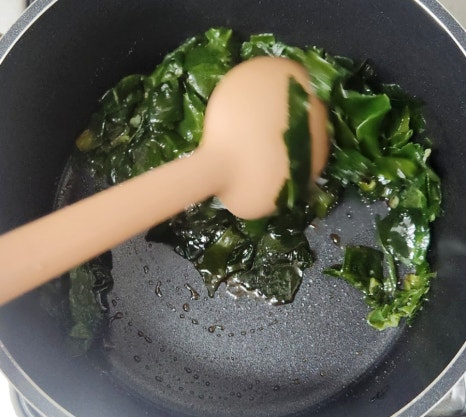 물기를 꼭 짠 미역을 냄비에 넣어 주세요. 그리고 참기름 3T를 두른 뒤 2분 정도 달달 볶아줍니다. 미역을 볶아 주는 과정은 국물의 풍미를 살리는 중요한 단계입니다.