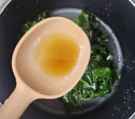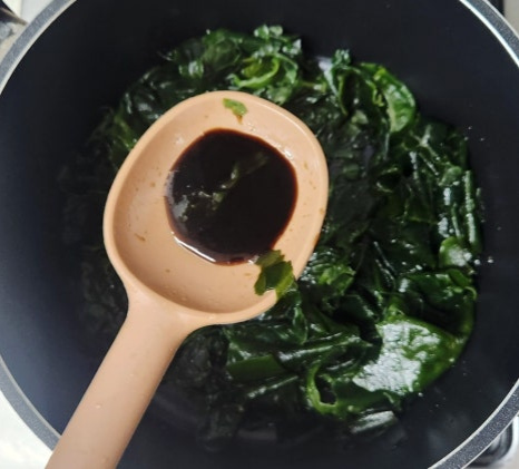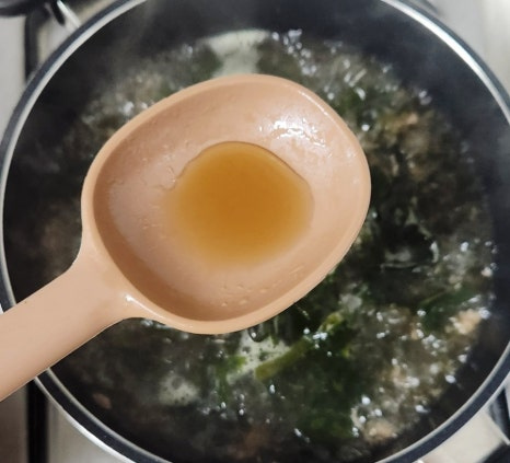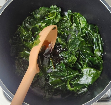 여기에 국간장 4T를 넣고 한 번 더 가볍게 볶아 주세요. 국간장은 미역국의 깊은 감칠맛을 살려줄 거예요. 이때 불을 너무 세게 하면 미역이 타거나 국간장이 금세 짜질 수 있으니 꼭 중불에서 볶아주세요.