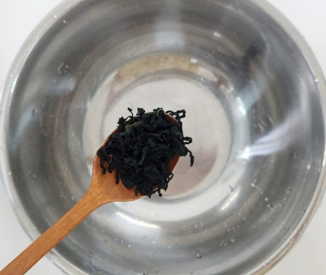자른 미역 크게 4T를 볼에 넣고 물을 넉넉하게 부어주세요. 최소 30분 정도 불려야 미역이 충분히 퍼지고 부드러워집니다.