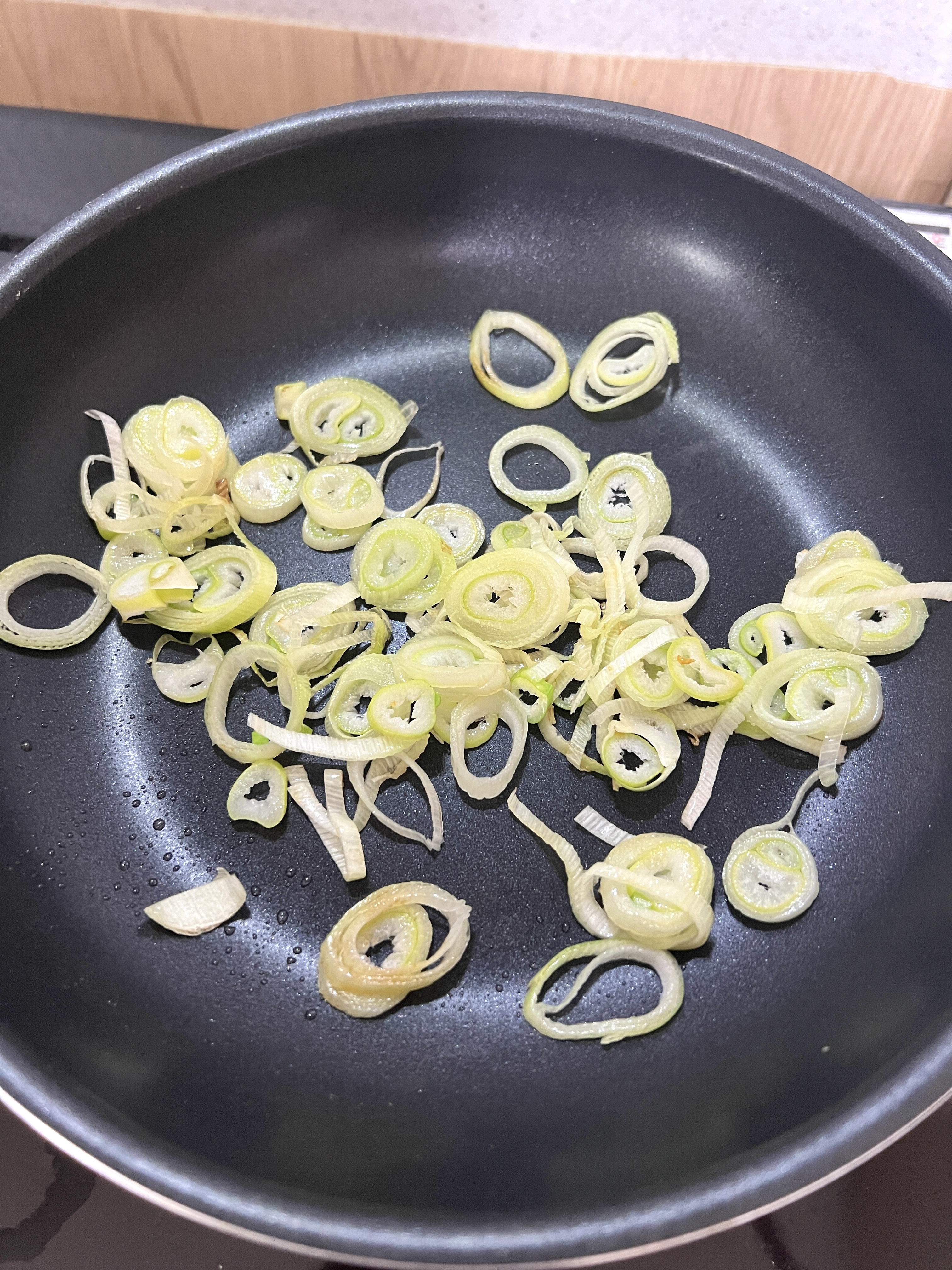 대파 초록 부분을 넣고 1분간 볶습니다.