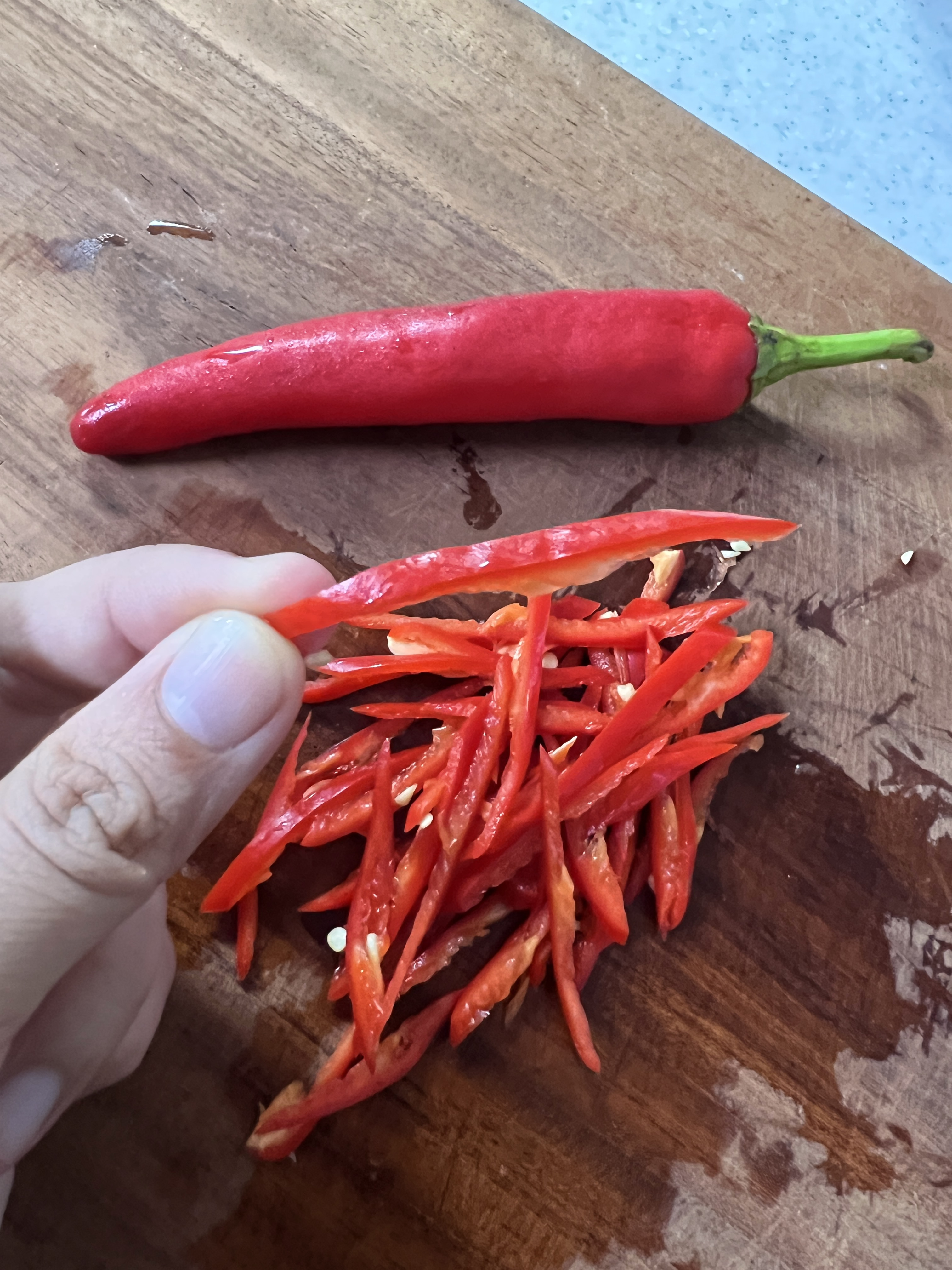 • 홍고추는 반으로 갈라 길게 채 썰기.